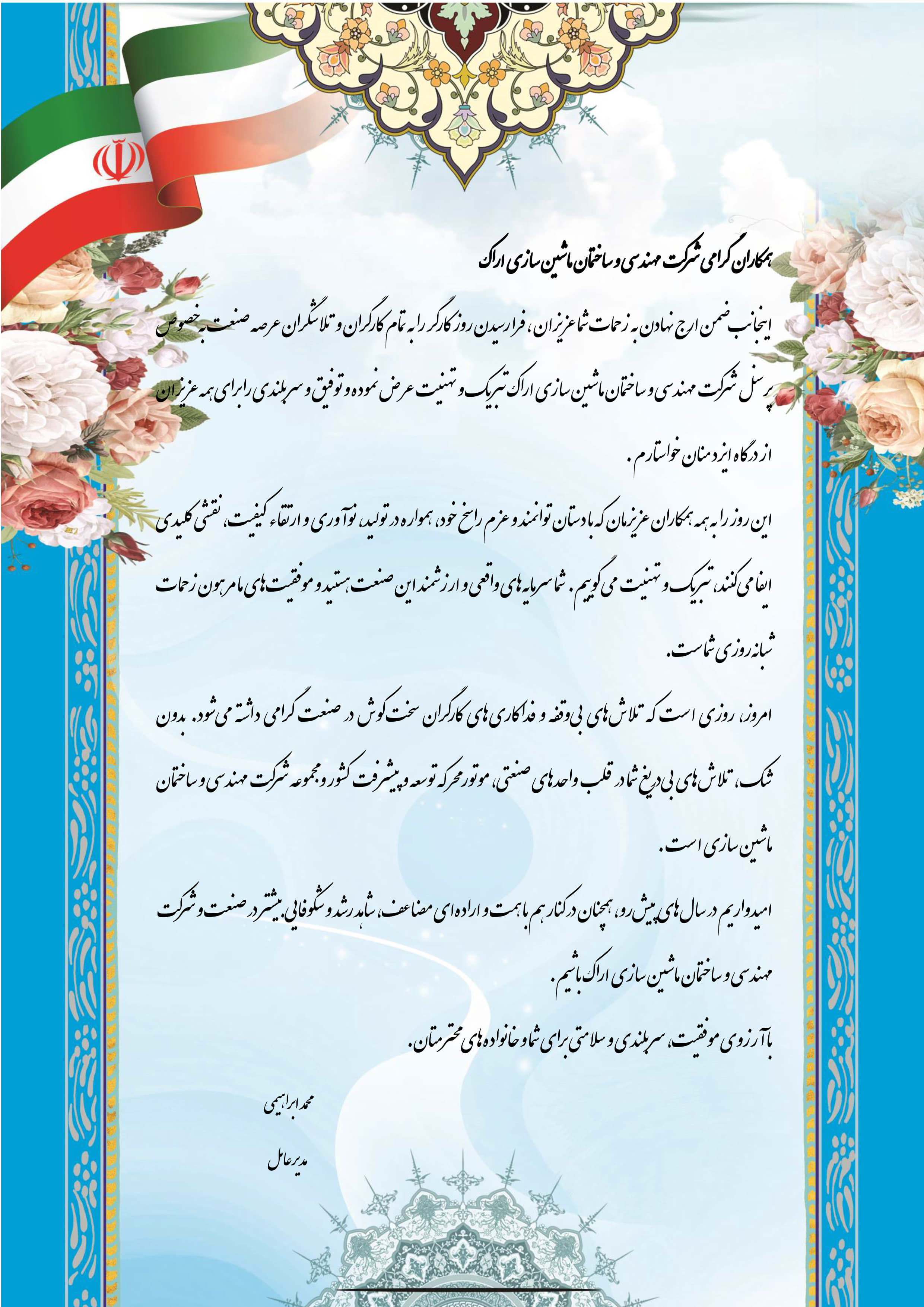 پیام تبریک مدیر عامل محترم به مناسبت روز جهانی کارگر
