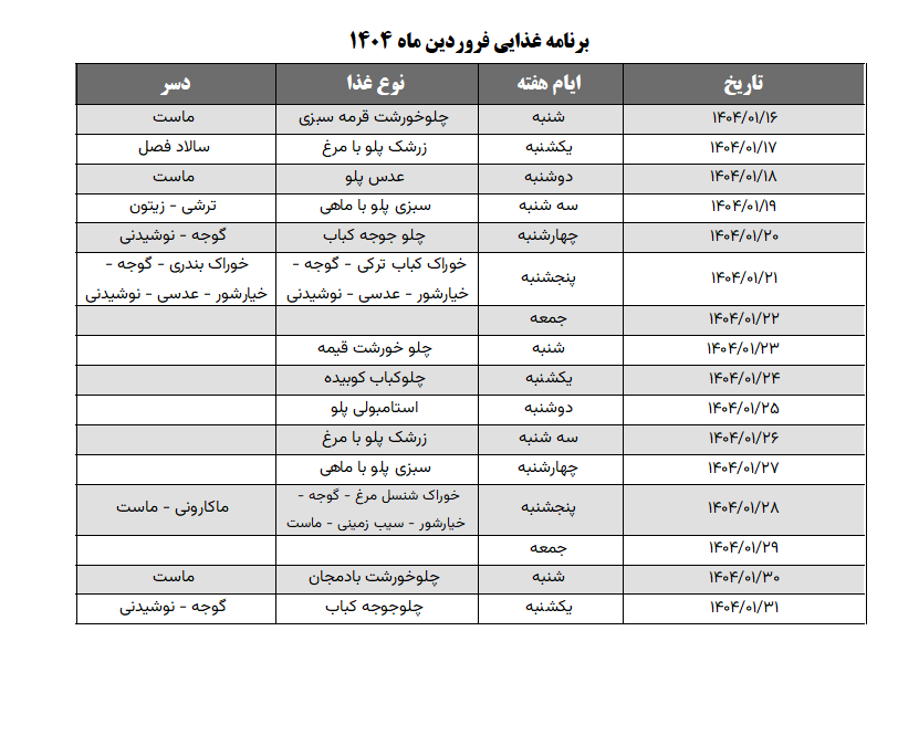 برنامه غذایی فروردین ۱۴۰۴