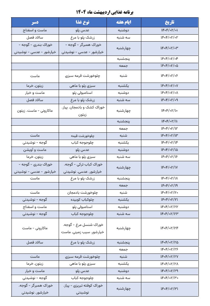 برنامه غذایی اردیبهشت ماه ۱۴۰۴