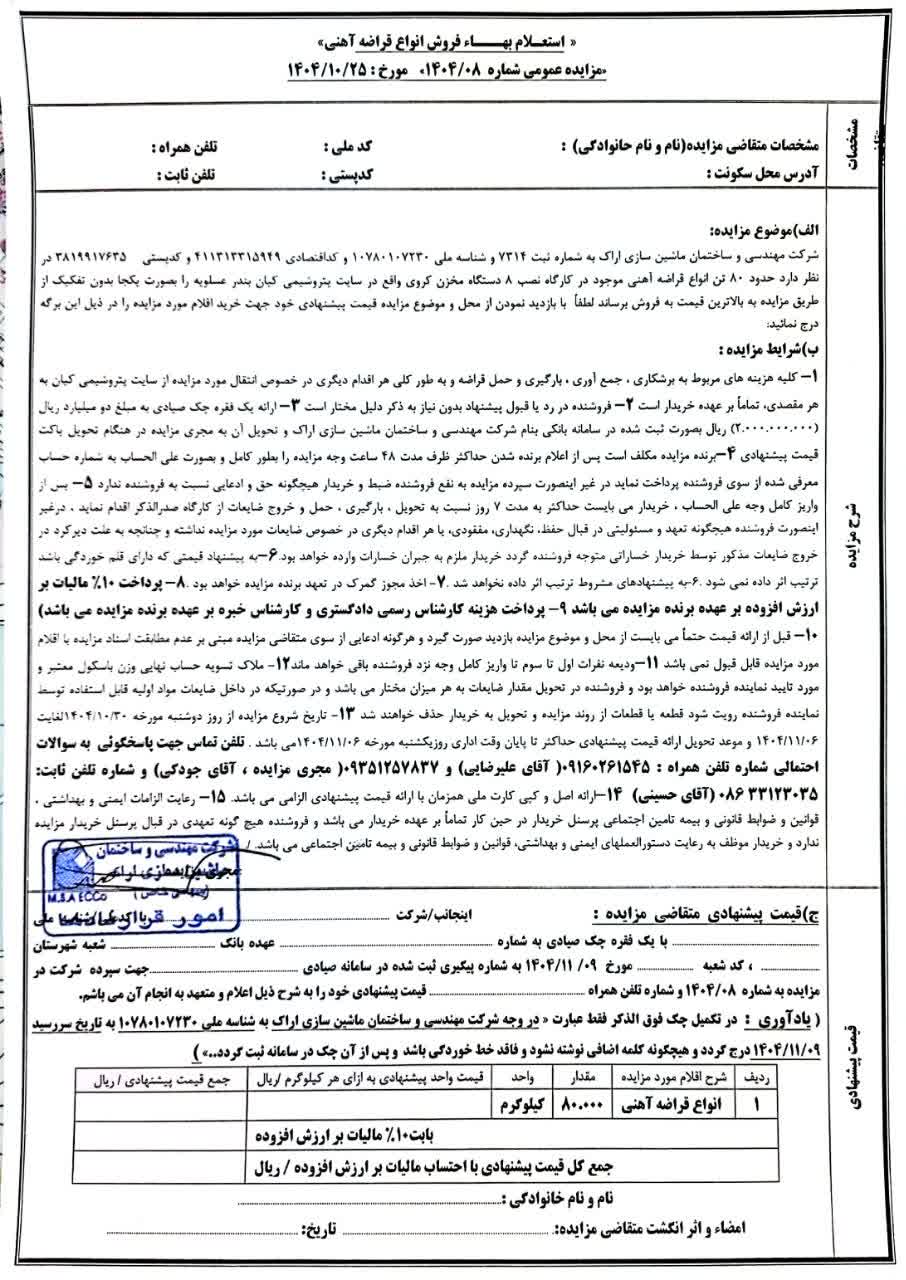 الف) موضوع مزایده: شرکت مهندسی و ساختمان ماشین‌سازی اراک به شماره ثبت ۷۲۱۴ و شناسه ملی ۱۰۷۸۰۱۷۲۳۰ و کد اقتصادی ۴۱۱۱۳۳۱۵۹۹، در نظر دارد حدود ۸۰ تن انواع قراضه آهنی موجود در کارخانه، شامل ضایعات و مخازن گروهی واقع در سایت پتروشیمی کیان بندر عسلویه، به‌صورت یکجا و بدون تفکیک، از طریق مزایده به فروش برساند. لذا متقاضیان محترم با بازدید نمودن از محل و موضوع مزایده، قیمت پیشنهادی خود جهت خرید اقلام مورد مزایده را در برگه ذیل درج نمایند.